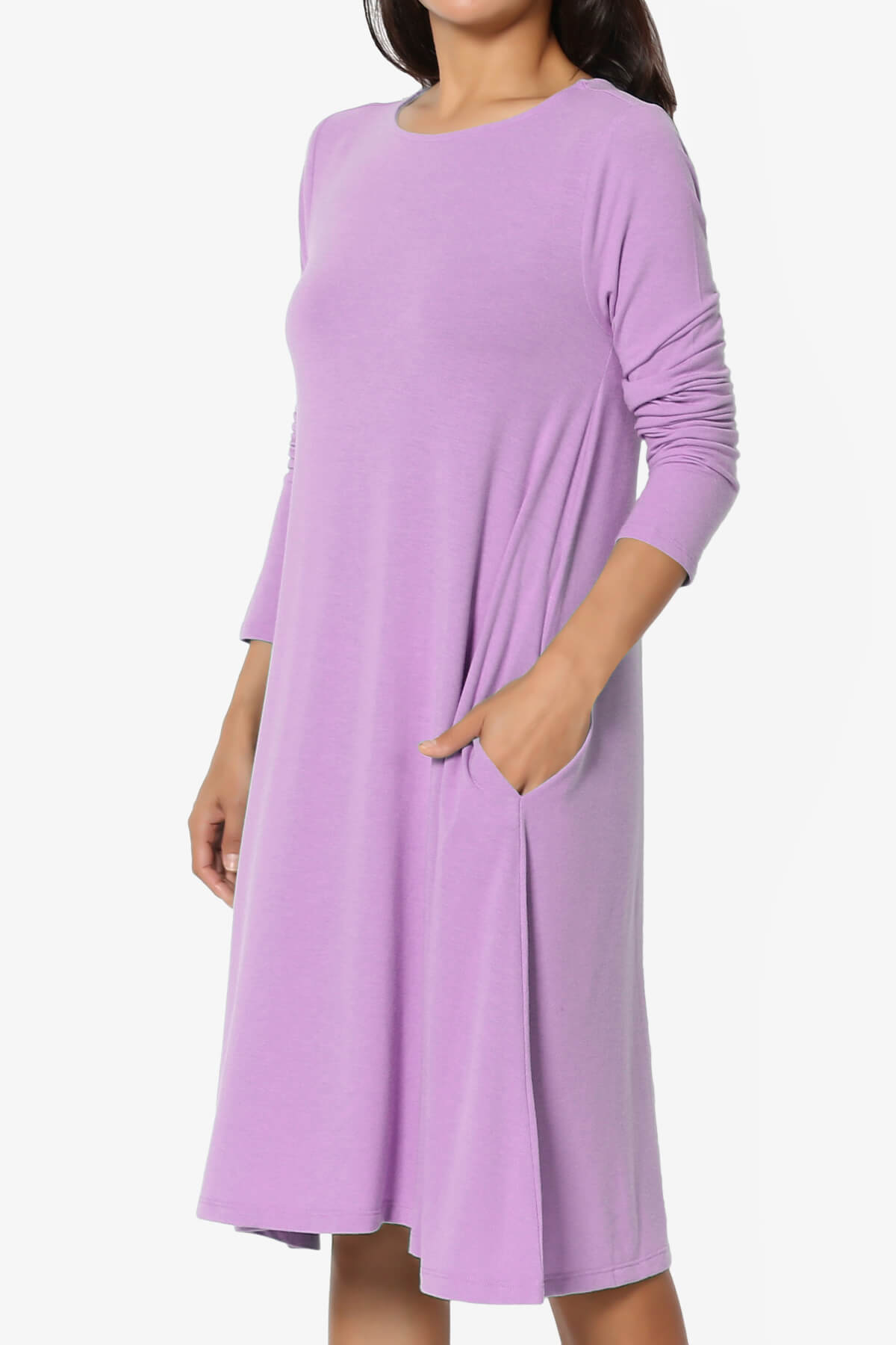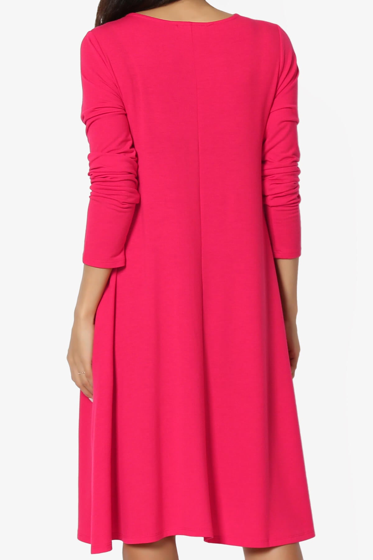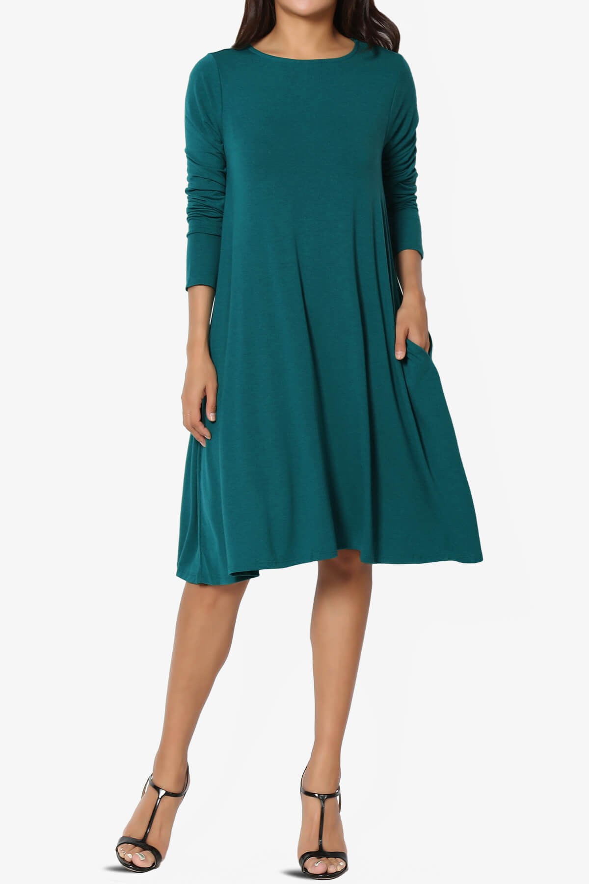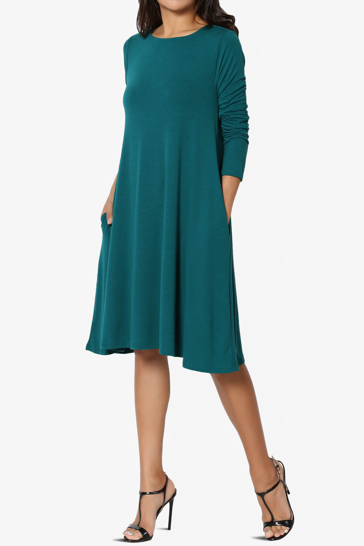 Boat neck, Long sleeves, Center seam at back, Side-seam pockets Flowy and flattering, the swing silhouette has a flared A-line shape you can dress up or down. “A” for effortless. 36" knee length, Premium soft jersey knit with comfortable stretch Fits true to size, take your normal size, S = Size(4-6), M = Size(8-10), L = Size(12-14), XL = Size(16-18) Model size : 5'3" height, 33" bust, 24" waist, 34" hip, and is wearing a size S 57% Polyester, 38% Rayon, 5% Spandex; Machine Washable Made in Vietnam NOTICE: Before order, please carefully read the Size Chart we provided in the pictures