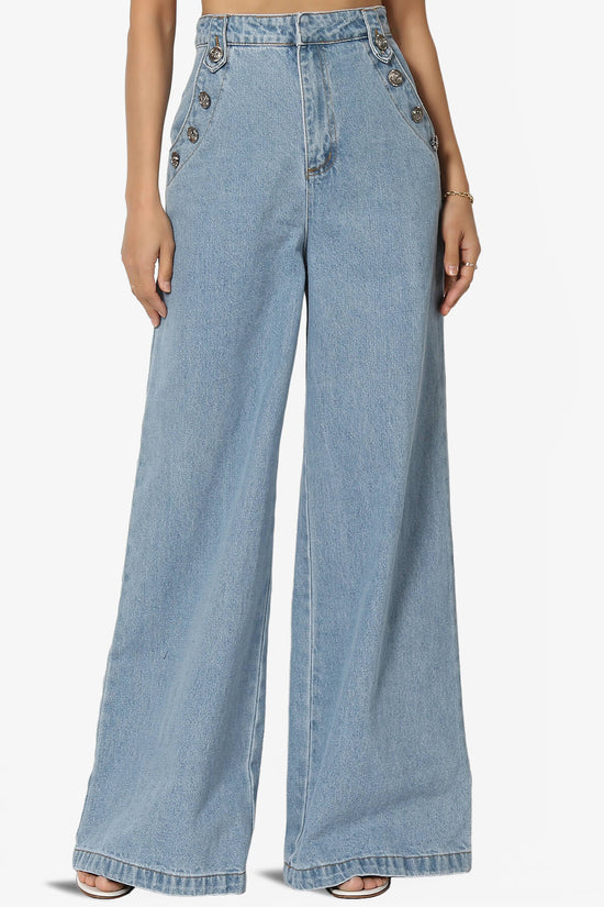 • High-waist vintage wide-leg jeans with retro-inspired button detail and flare-leg cut for effortless style.