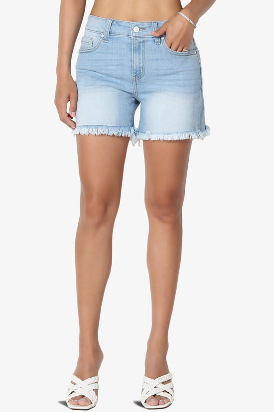 It is always a fun day whenever you can wear these stretch denim shorts with frayed hems and a faded wash that complement your on-the-go lifestyle. Wear yours with sweaters, T-shirts and blouses alike.Whiskered, faded, mild distressed, stretch denim jean shorts Zip fly with button closure, five-pocket silhouette, belt loops High rise, cut for a slim fit with a frayed hem, Versatile stone wash Fits true to US size, S=Size(4-6), M=Size(8-10), L=Size(12-14), XL=Size(16-18) Model size : 5'3" height, 34" bust, 24" waist, 34" hip, and is wearing a size S 98% Cotton, 2% Spandex; Machine Washable Made in Vietnam NOTICE: Before order, please carefully read the Size Chart we provided in the pictures