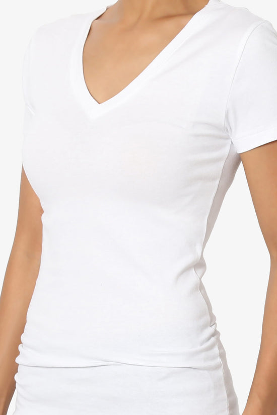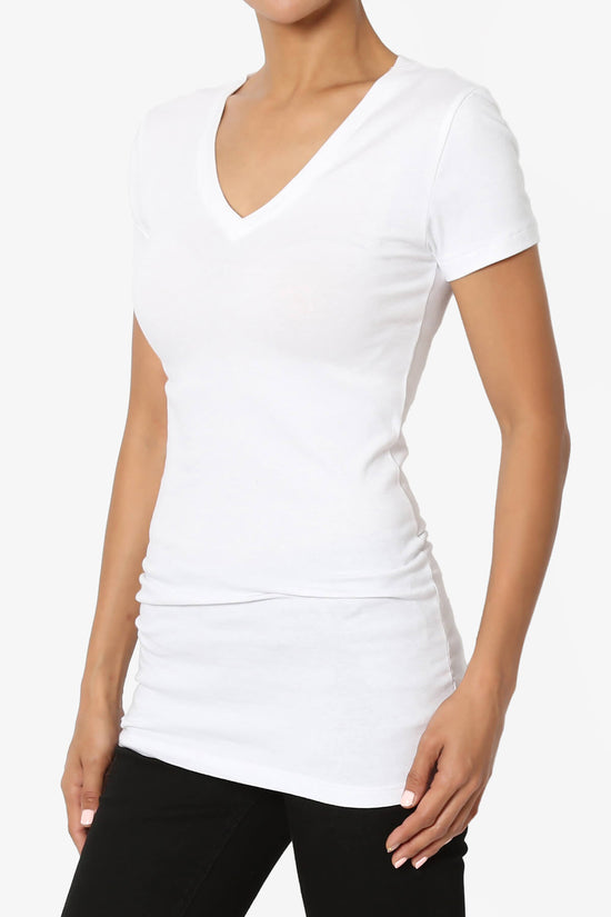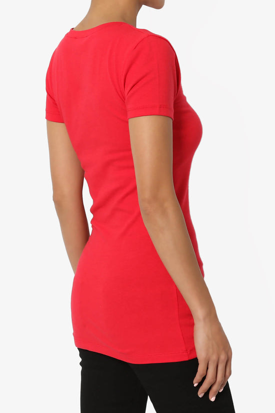 V-neckline, Short sleeve T-shirts are the layering essential your closet needs. Slim fit, extended length, Plain solid color Stretch cotton blend for a soft, comfortable fit Style with everything from slim denim to a flowing maxi skirt—there's no wrong way to wear this piece. Model size : 5'4" height, 33" bust, 24" waist, 34" hip, and is wearing a size S, Fits true to US size, S=Size(2-4), M=Size(6-8), L=Size(10-12), XL=Size(14-16) 95% Cotton, 5% Spandex; Machine Washable Made in Cambodia NOTICE: Before order, please carefully read the Size Chart we provided in the pictures