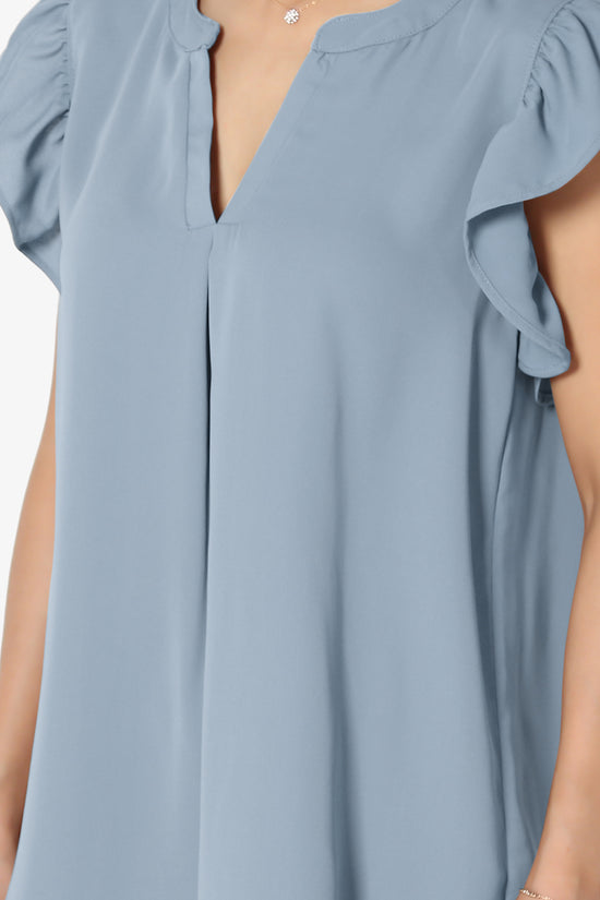 Amp up your day with this breezy blouse featuring a split neck and fun ruffled sleeves. Design has a flattering and comfortable, relaxed silhouette. Wear it with trousers or skirts.