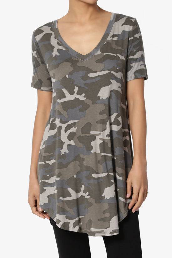 This camo-printed short sleeve top is a surprisingly versatile piece you'll want to wear with everything and all season spring, summer, fall, winter . Add a touch of trend-right camo to your off-duty wardrobe with this soft, comfy lightweight jersey tee. Tuck in to denim or leather pants, versatile cool-girl silhouette that go from day to night with ease.V-Neck, Short Sleeves Curved hem, Extended length for cover your hip Lightweight soft & comfy stretchy jersey knit fabric Fits true to US size, S=Size(4-6), M=Size(8-10), L=Size(12-14), XL=Size(16-18) Model size : 5'3" height, 33" bust, 24" waist, 34" hip, and is wearing a size S 93% Rayon, 7% Spandex; Machine wash with laundry bag recommended Made in Cambodia NOTICE: Before order, please carefully read the Size Chart we provided in the pictures