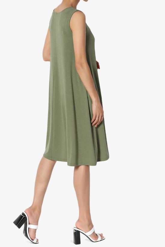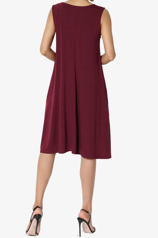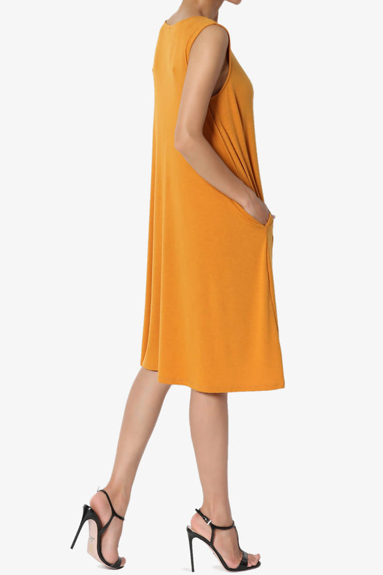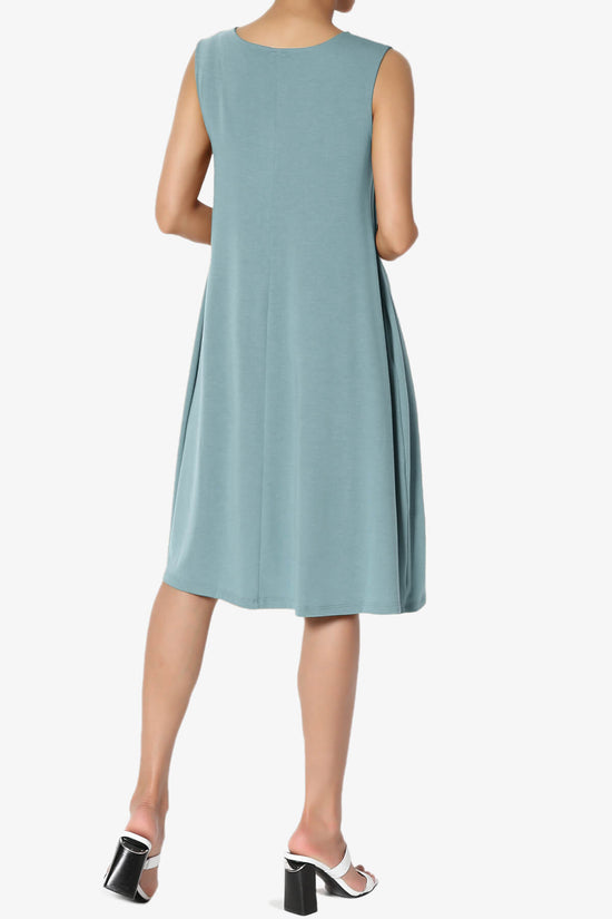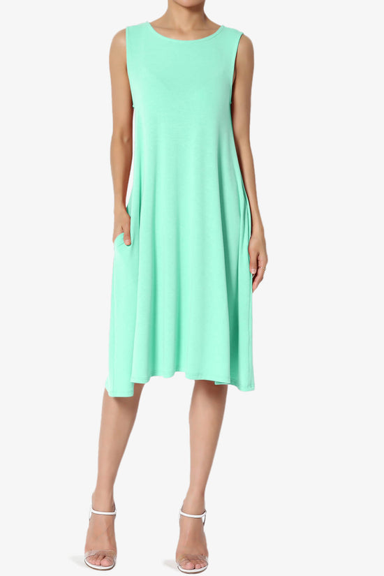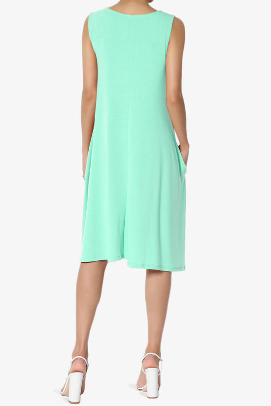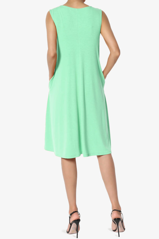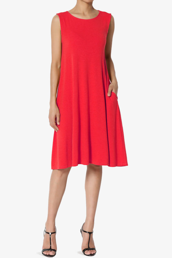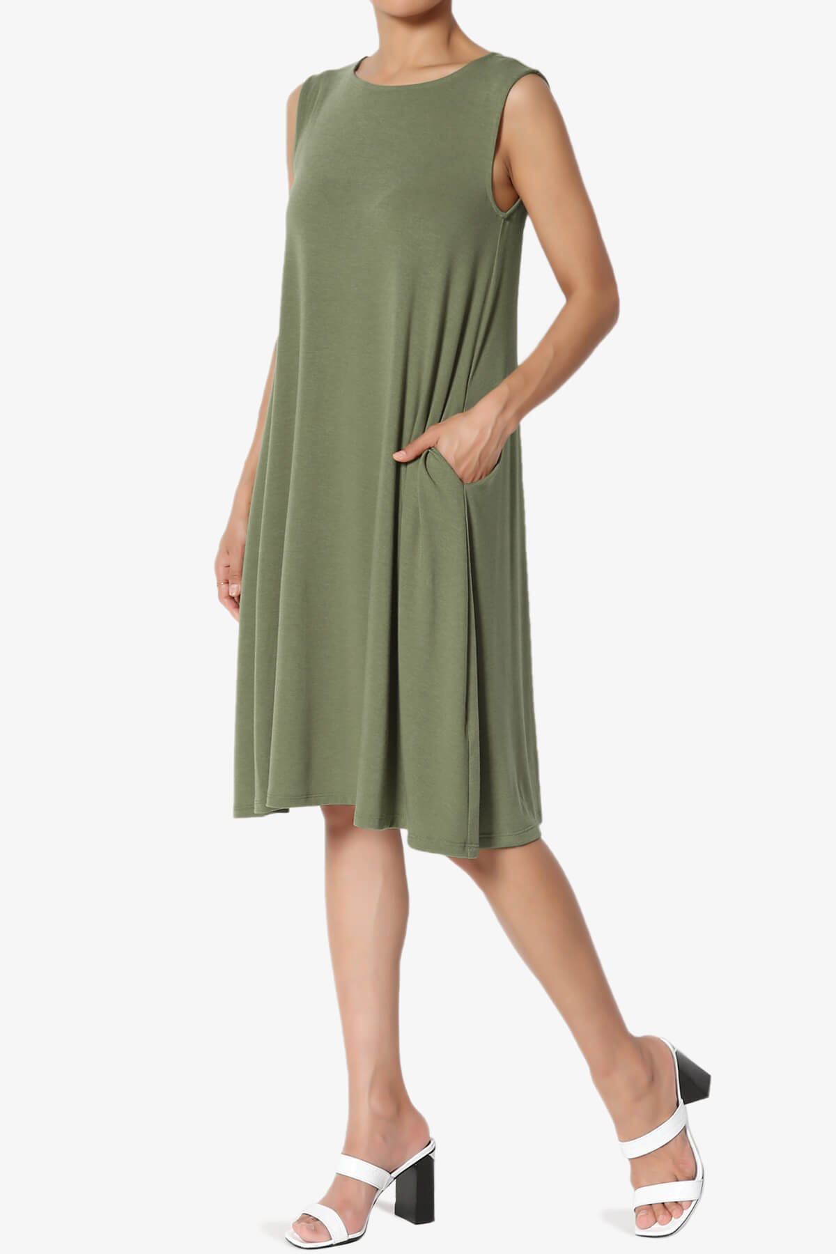 This crew neck, knee-length dress boasts convenient pockets and a sleeveless design, perfect for summer.