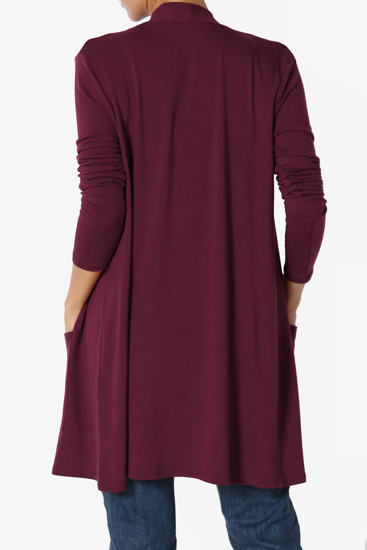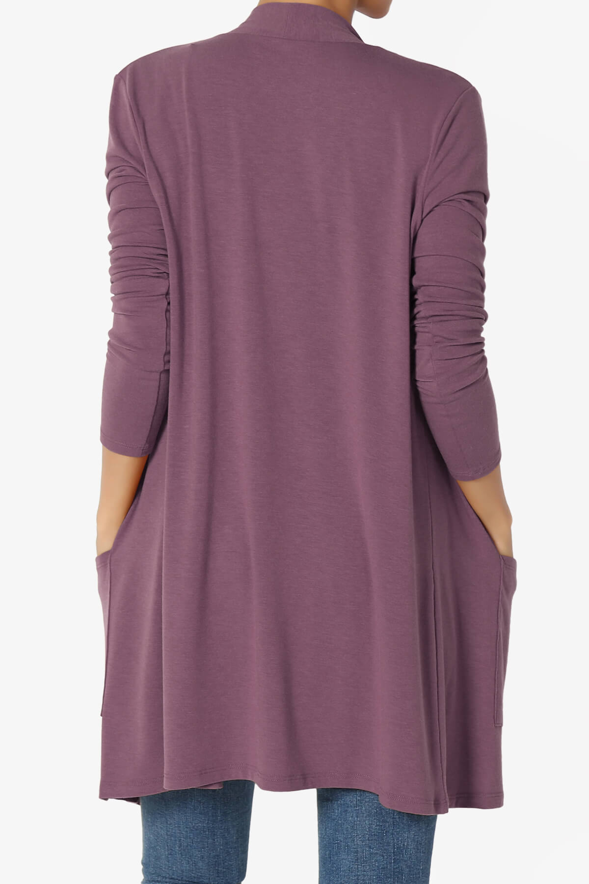 Made from a lightweight, stretchy jersey knit, it features utility front pockets, a relaxed drapey fit, and a timeless collarless design.