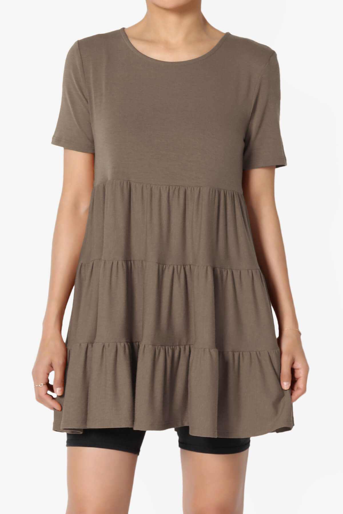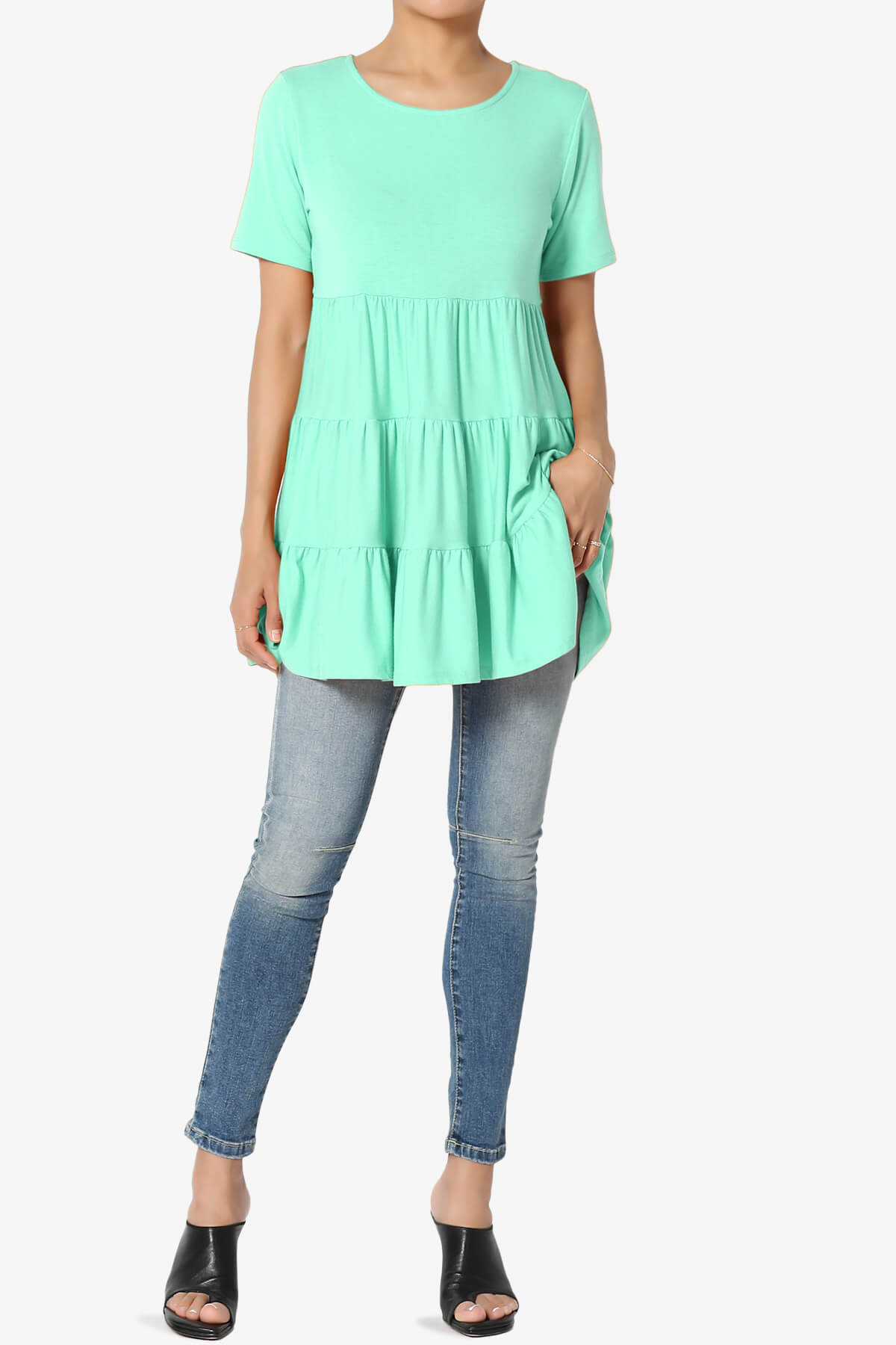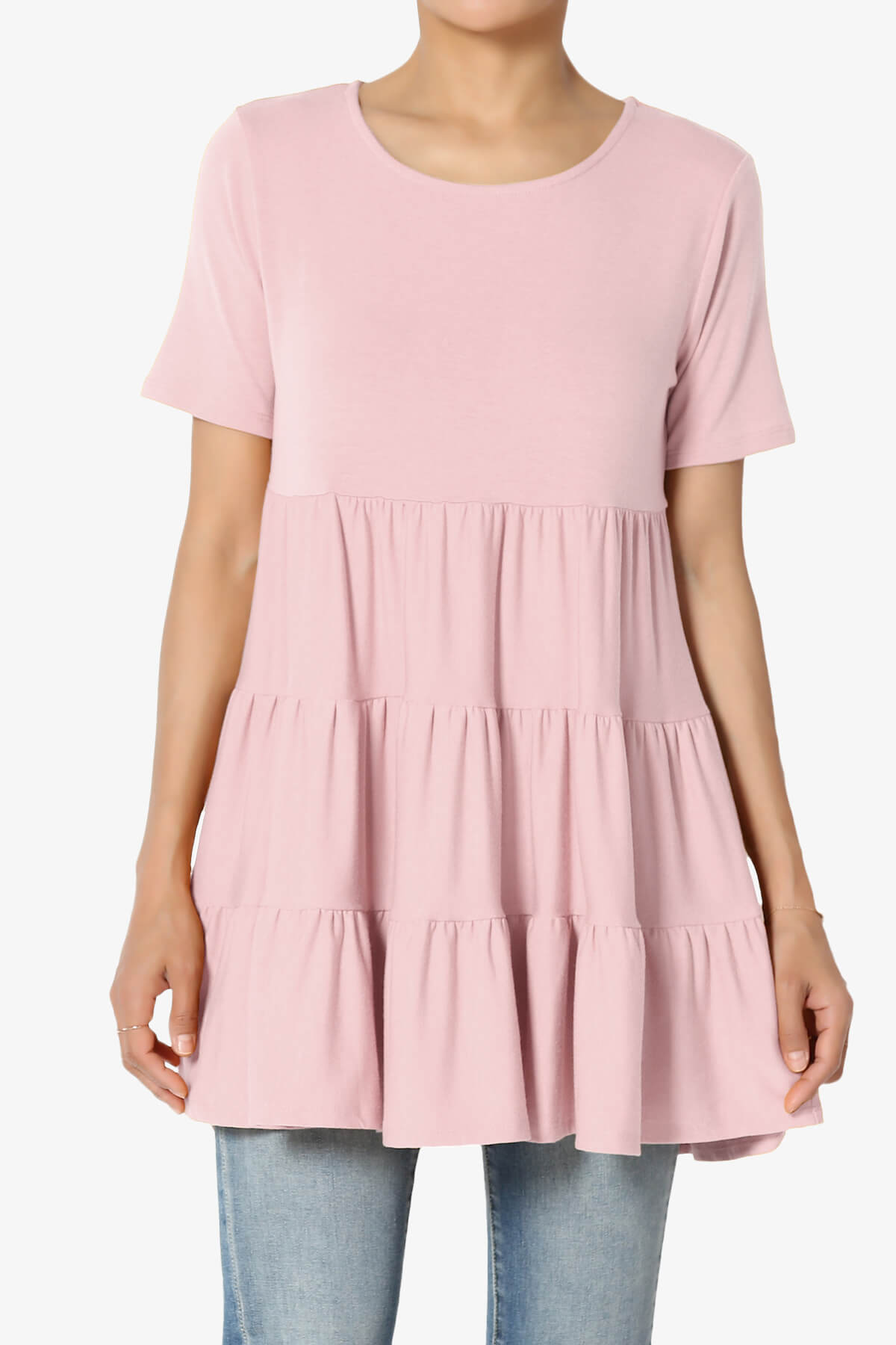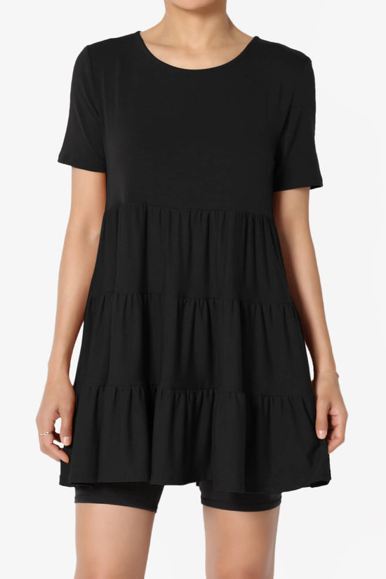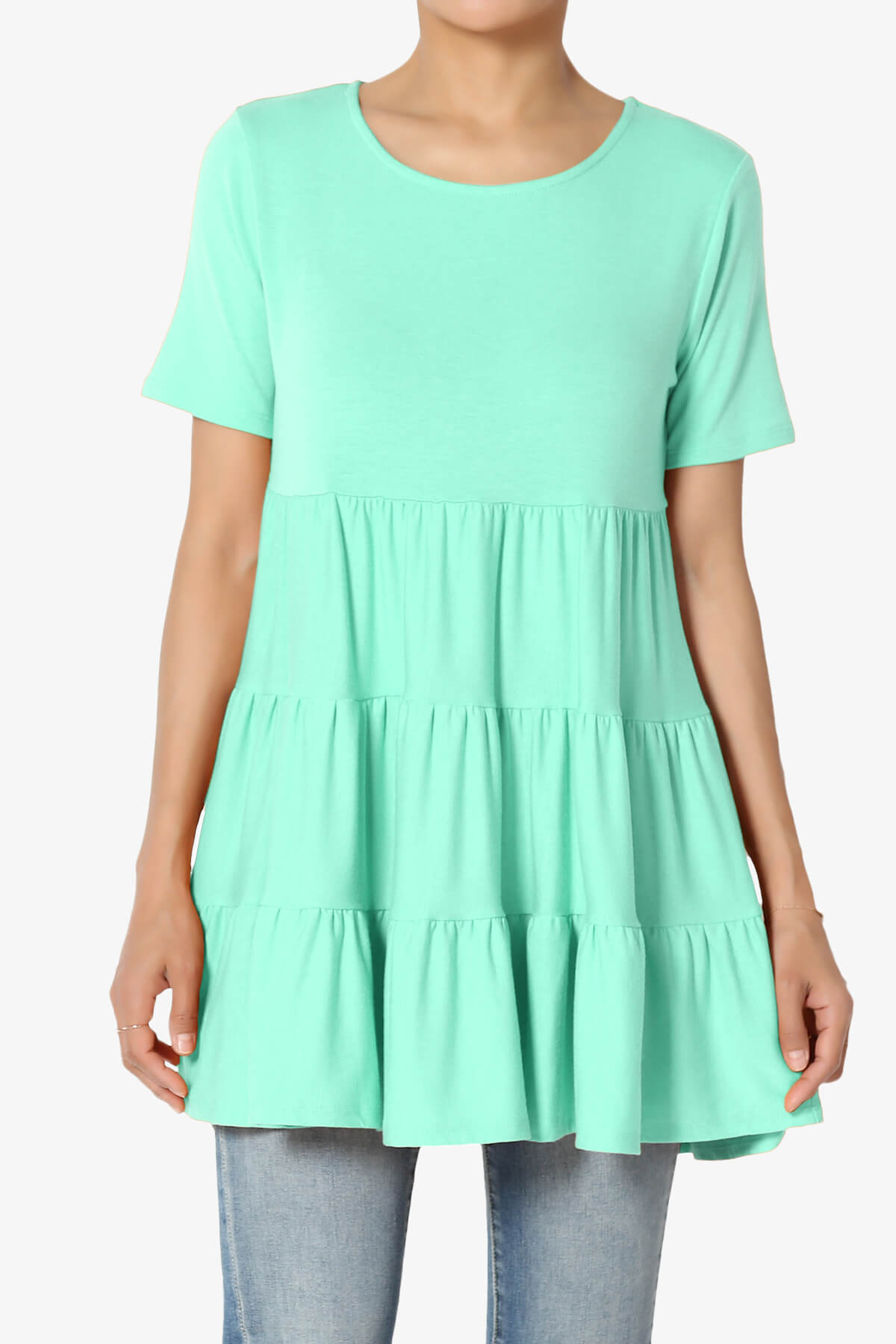 Soft knit babydoll tunic top with tiered ruffle layers, short sleeves, and a relaxed A-line silhouette Made from a lightweight polyester blend with stretch jersey comfort, perfect for spring, summer, or fall Features a crew neck and pull-on style ideal for everyday casual, festival fashion, or weekend travel Pairs perfectly with leggings, biker shorts, or denim for a cute streetwear or lounging-ready look Model size : 5'4" height, 34" bust, 24" waist, 34" hip, and is wearing a size S, Fits small to US size, S=Size(2-4), M=Size(6-8), L=Size(10-12), XL=Size(14-16) 57% Polyester, 38% Rayon, 5% Spandex; Machine Washable Made in Vietnam NOTICE: Before order, please carefully read the Size Chart we provided in the pictures