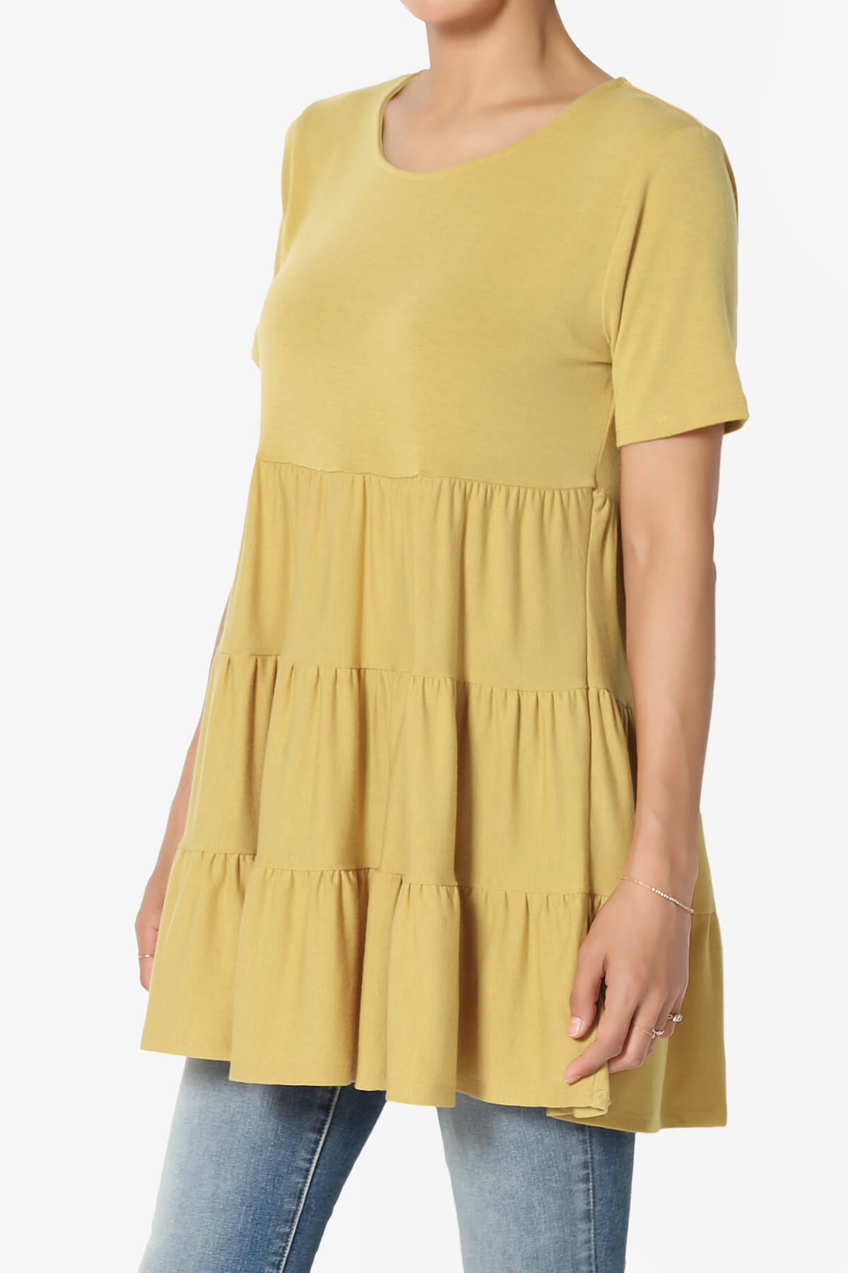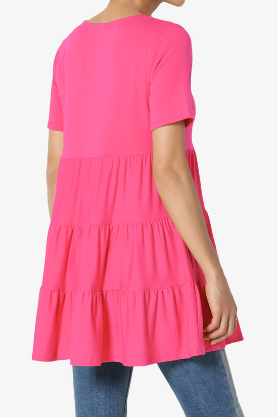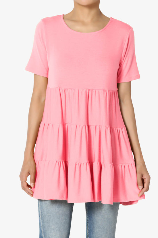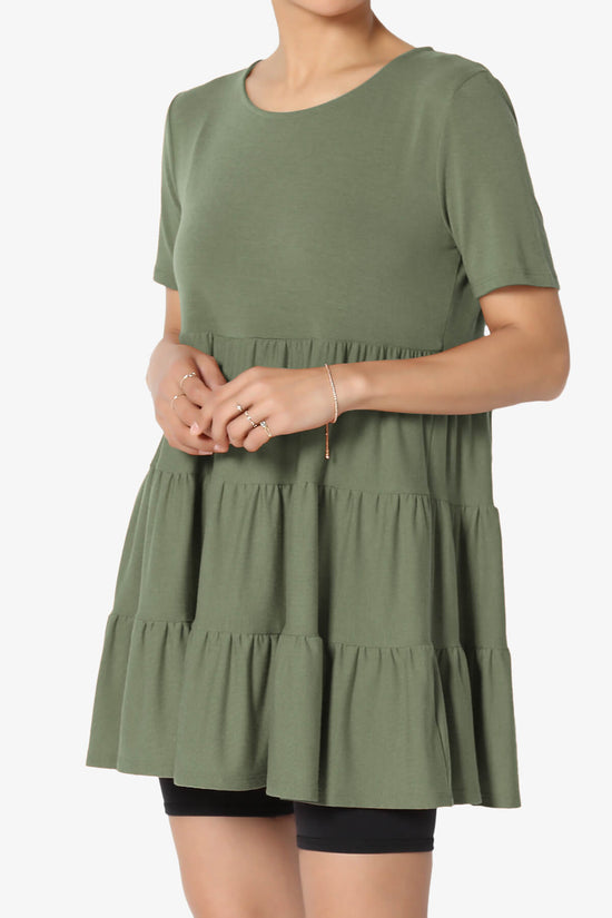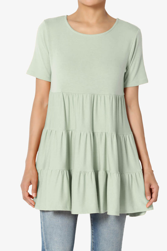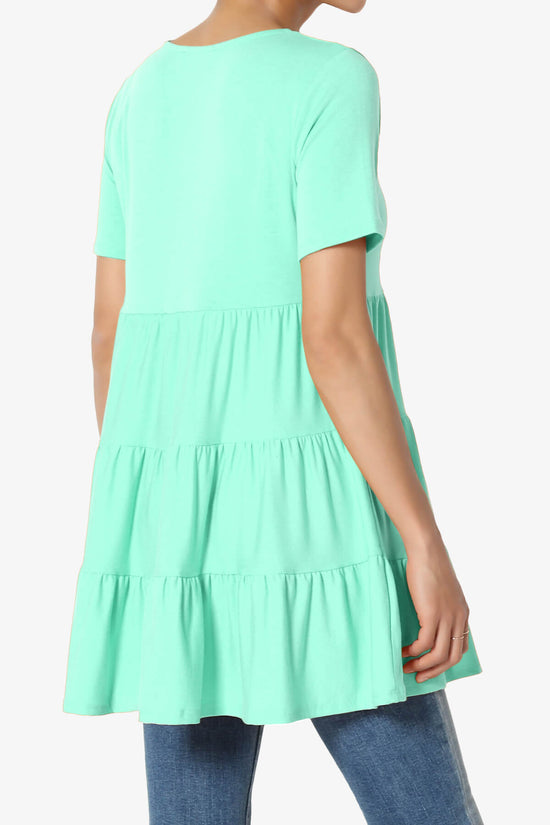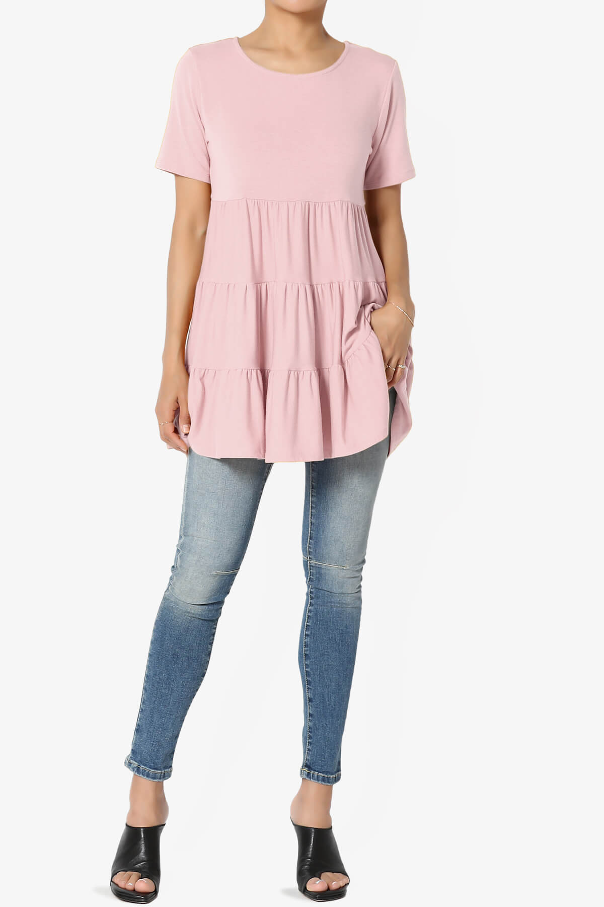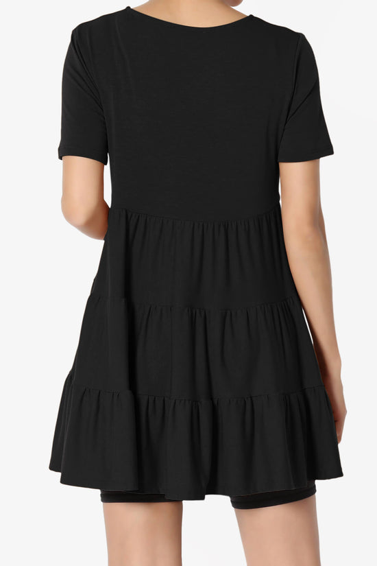 Soft knit babydoll tunic top with tiered ruffle layers, short sleeves, and a relaxed A-line silhouette Made from a lightweight polyester blend with stretch jersey comfort, perfect for spring, summer, or fall Features a crew neck and pull-on style ideal for everyday casual, festival fashion, or weekend travel Pairs perfectly with leggings, biker shorts, or denim for a cute streetwear or lounging-ready look Model size : 5'4" height, 34" bust, 24" waist, 34" hip, and is wearing a size S, Fits small to US size, S=Size(2-4), M=Size(6-8), L=Size(10-12), XL=Size(14-16) 57% Polyester, 38% Rayon, 5% Spandex; Machine Washable Made in Vietnam NOTICE: Before order, please carefully read the Size Chart we provided in the pictures