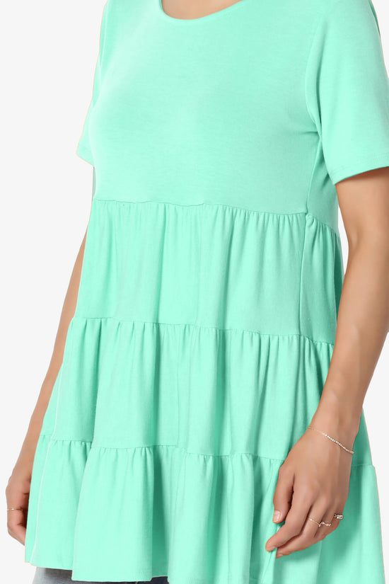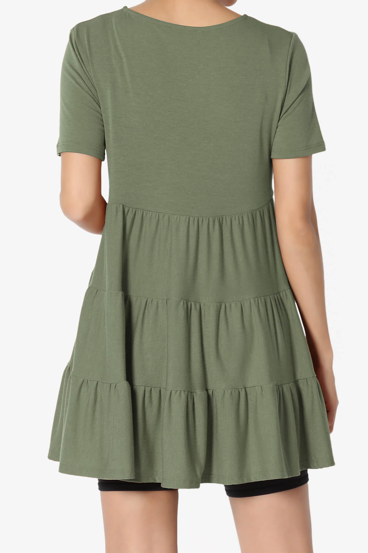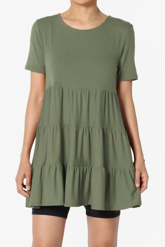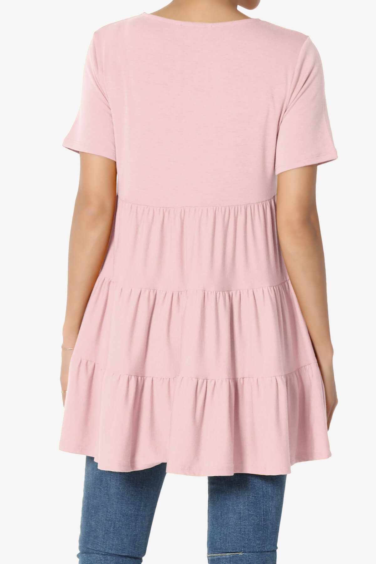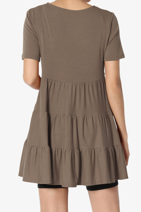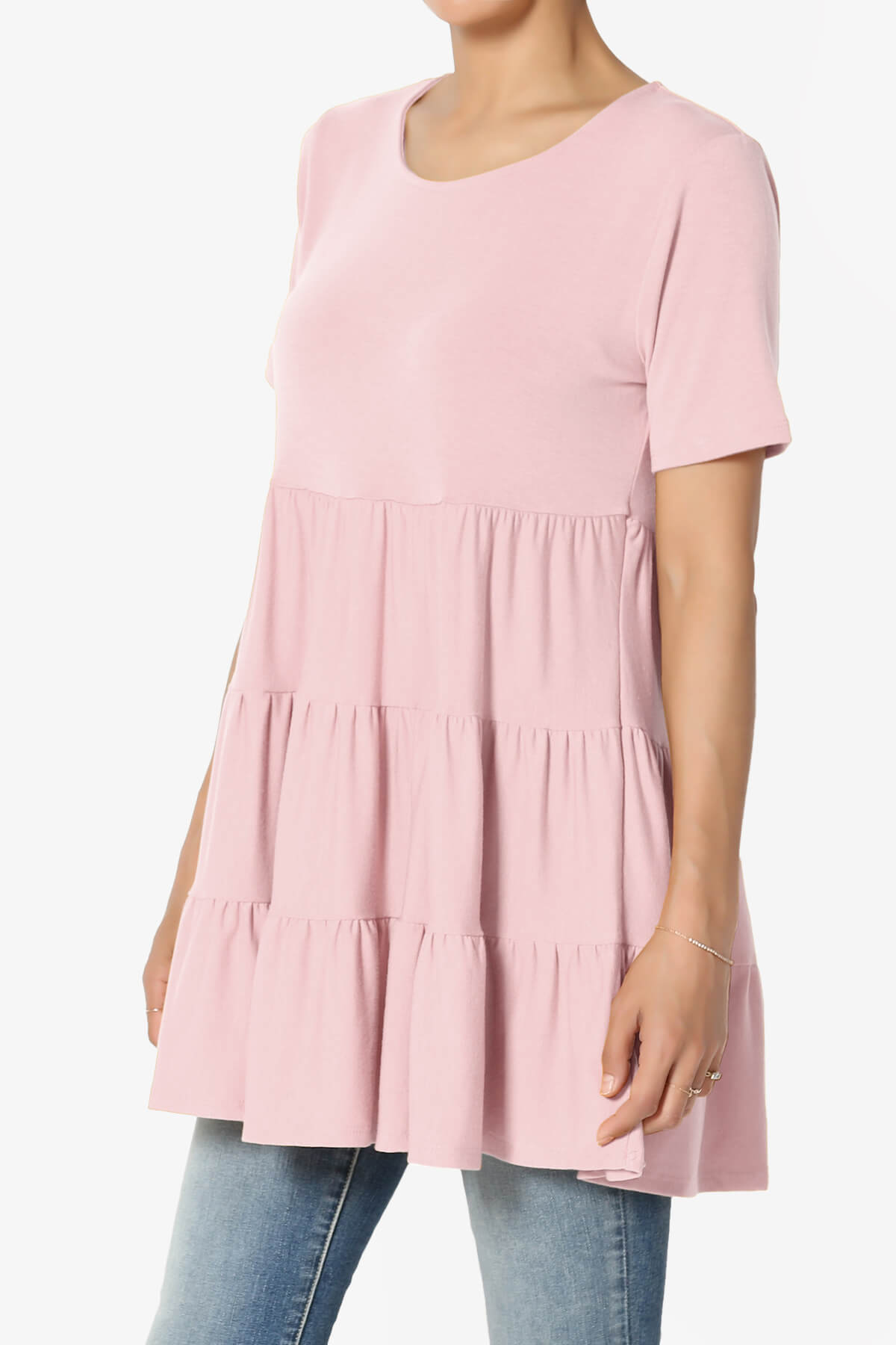Soft knit babydoll tunic top with tiered ruffle layers, short sleeves, and a relaxed A-line silhouette Made from a lightweight polyester blend with stretch jersey comfort, perfect for spring, summer, or fall Features a crew neck and pull-on style ideal for everyday casual, festival fashion, or weekend travel Pairs perfectly with leggings, biker shorts, or denim for a cute streetwear or lounging-ready look Model size : 5'4" height, 34" bust, 24" waist, 34" hip, and is wearing a size S, Fits small to US size, S=Size(2-4), M=Size(6-8), L=Size(10-12), XL=Size(14-16) 57% Polyester, 38% Rayon, 5% Spandex; Machine Washable Made in Vietnam NOTICE: Before order, please carefully read the Size Chart we provided in the pictures