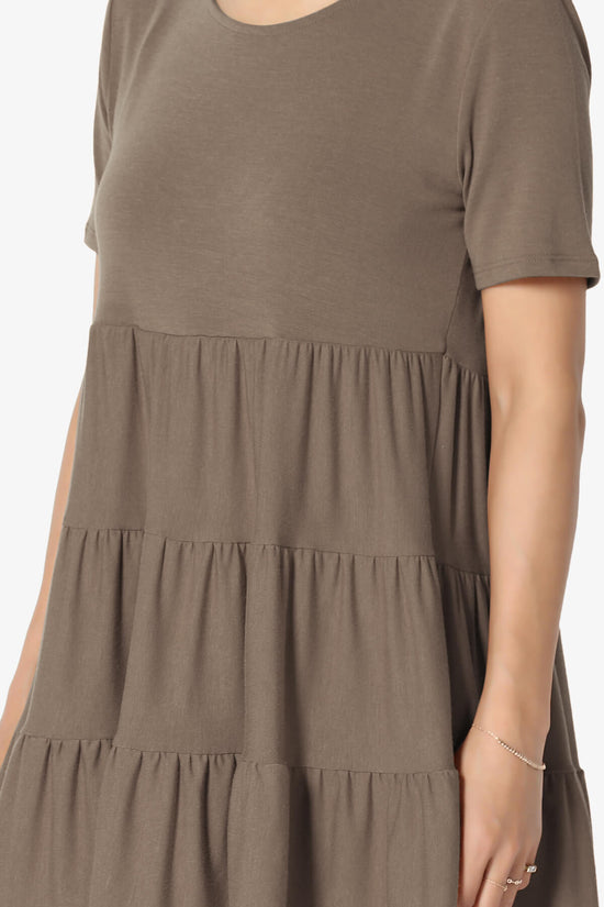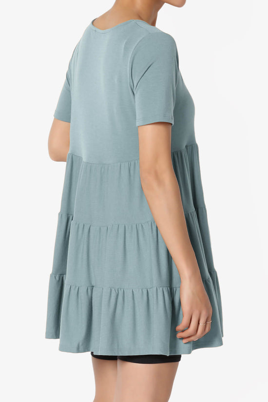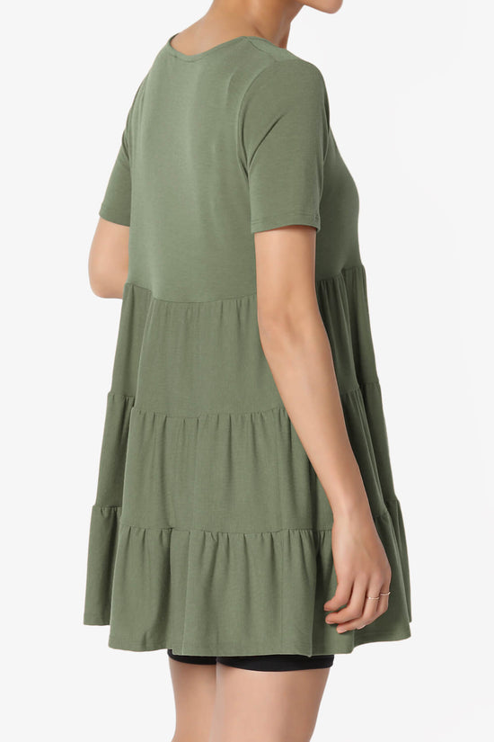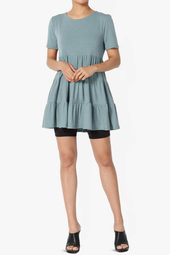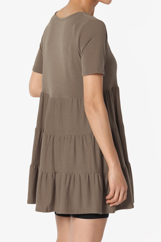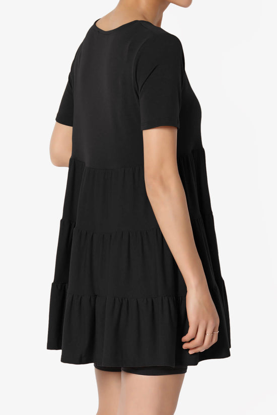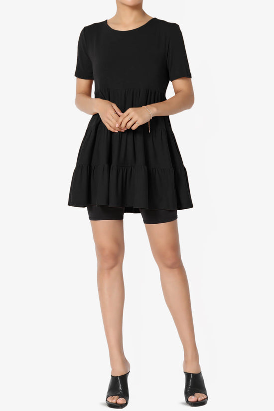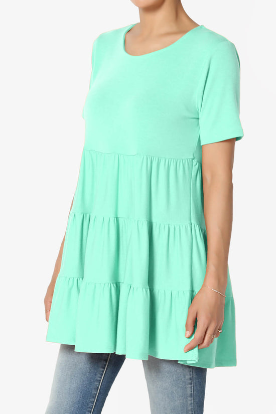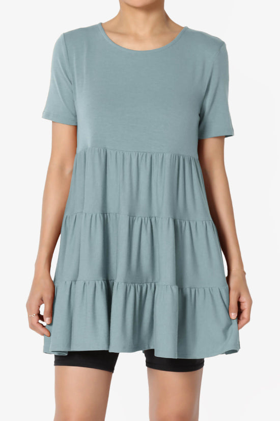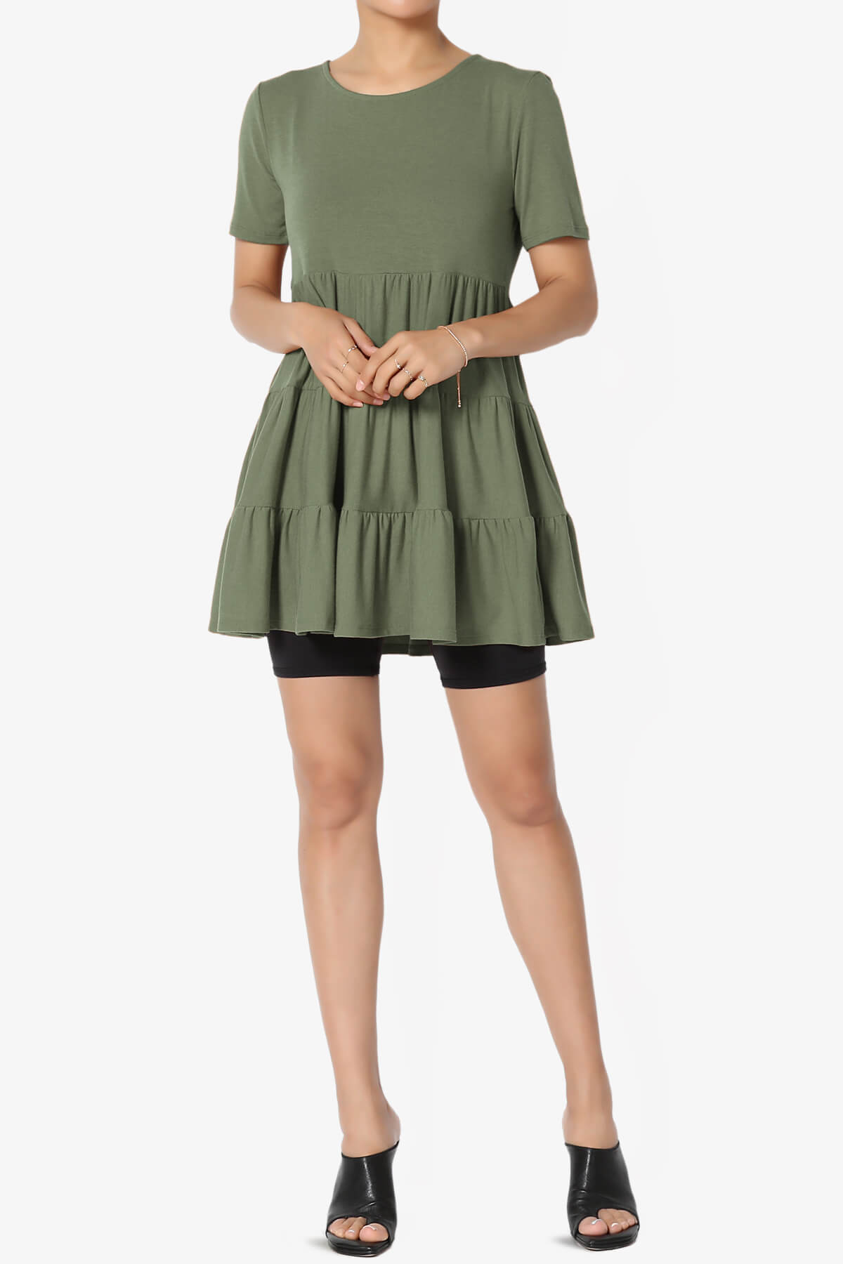 Soft knit babydoll tunic top with tiered ruffle layers, short sleeves, and a relaxed A-line silhouette Made from a lightweight polyester blend with stretch jersey comfort, perfect for spring, summer, or fall Features a crew neck and pull-on style ideal for everyday casual, festival fashion, or weekend travel Pairs perfectly with leggings, biker shorts, or denim for a cute streetwear or lounging-ready look Model size : 5'4" height, 34" bust, 24" waist, 34" hip, and is wearing a size S, Fits small to US size, S=Size(2-4), M=Size(6-8), L=Size(10-12), XL=Size(14-16) 57% Polyester, 38% Rayon, 5% Spandex; Machine Washable Made in Vietnam NOTICE: Before order, please carefully read the Size Chart we provided in the pictures