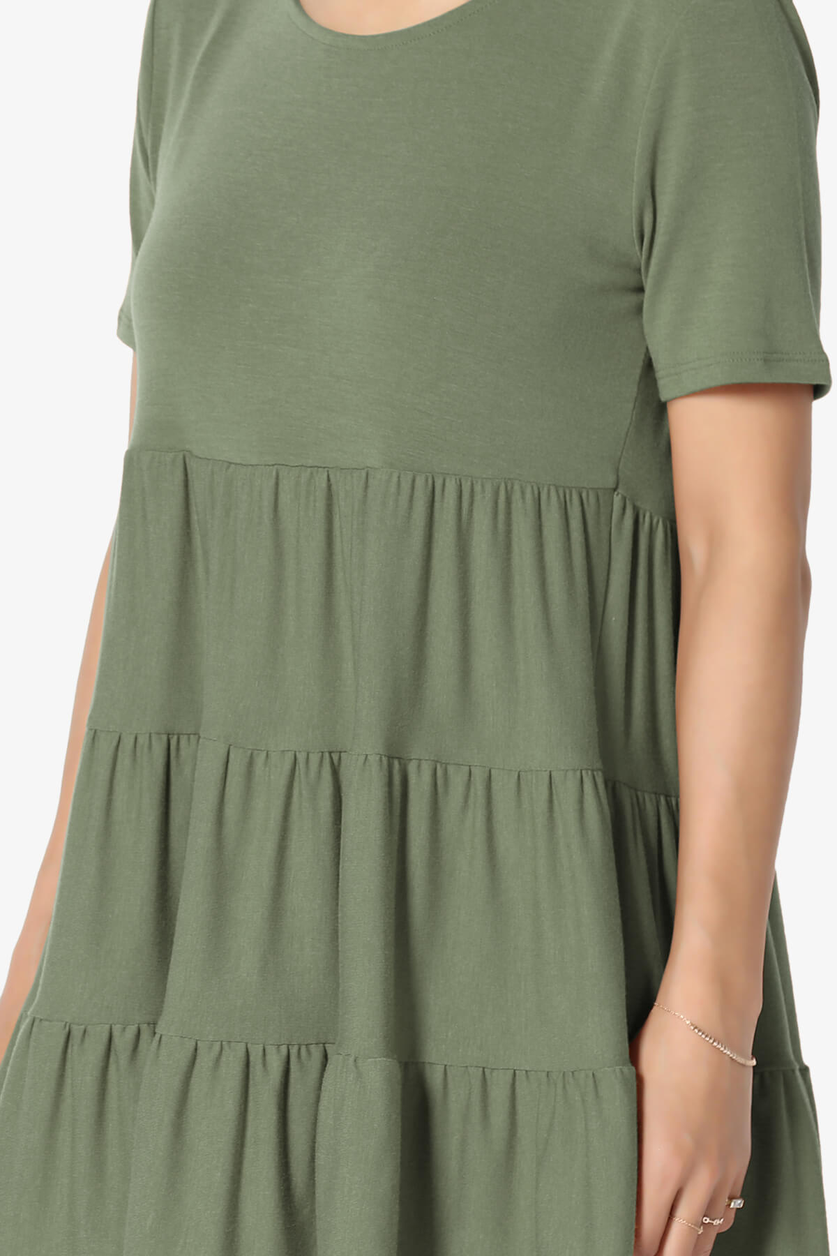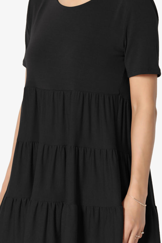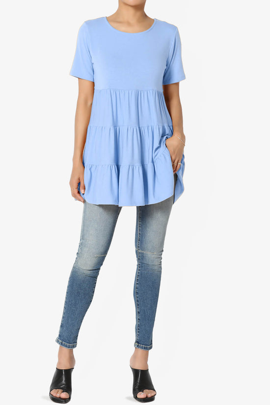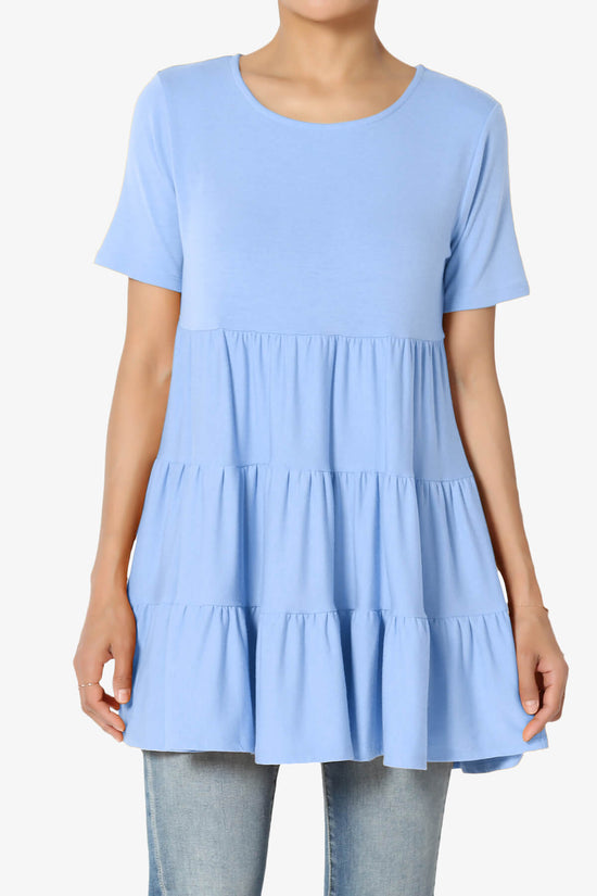 Designed with a crew neck, short sleeves, and ruffled tiered layers, it flatters every shape with its relaxed fit and soft stretch jersey knit.